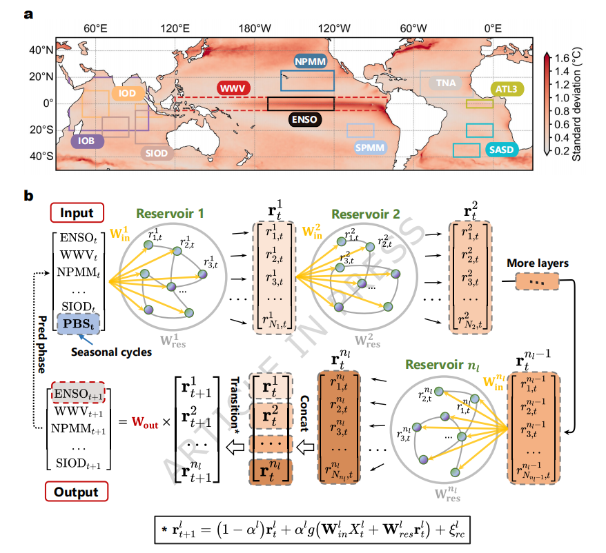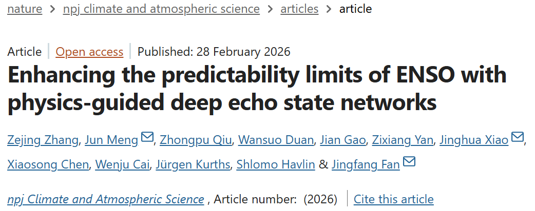 Zejing Zhang, Jun Meng, Zhongpu Qiu, Wansuo Duan, Jian Gao, Zixiang Yan, Jinghua Xiao, Xiaosong Chen, Wenju Cai, Jürgen Kurths, Shlomo Havlin & Jingfang Fan. Enhancing the predictability limits of ENSO with physics-guided deep echo state networks. npj Climate and Atmospheric Science (2026). https://doi.org/10.1038/s41612-026-01360-5