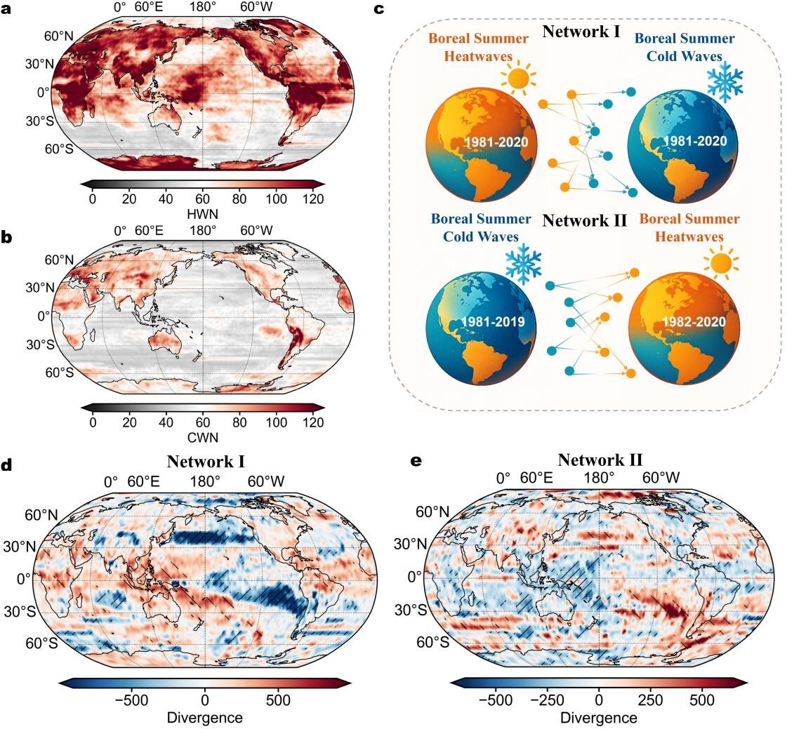在全球变暖背景下,极端事件更趋频发并呈现更强的同步性与复合风险,使热浪与寒流的影响不再局限于局地天气尺度,其跨区域、跨季节耦合可能触发级联式、多尺度效应。近期,中国科学院大气物理研究所地球系统数值模拟与应用全国重点实验室孟君副研究员与北京邮电大学在读博士生于平在Chaos发表论文“Climate network reveals Cross-seasonal teleconnections between heatwaves and cold waves”,基于 NCEP–NCAR 再分析资料(1981—2020)并采用 TX90p/TN10p 标准识别热浪和寒流事件,构建“夏季热浪与随后冬季寒流”(网络I)与“冬季寒流与次年夏季热浪”(网络II)两类跨季节有向气候网络,揭示了显著且稳健的长距离遥相关结构;网络散度分布结果进一步显示关键区域在两类网络中呈现“源—汇”角色的系统性转换,而联合EOF分析表明该跨季节协同变化受 ENSO 与北极涛动(AO)等大尺度气候模态共同调制,为网络识别到的遥相关提供了动力学解释。该成果不仅完善了对极端事件跨区域、跨季节相互关联的认识,也为季节—年际尺度极端事件预测、复合风险评估及早期预警体系的构建提供了新的方法框架与物理依据。