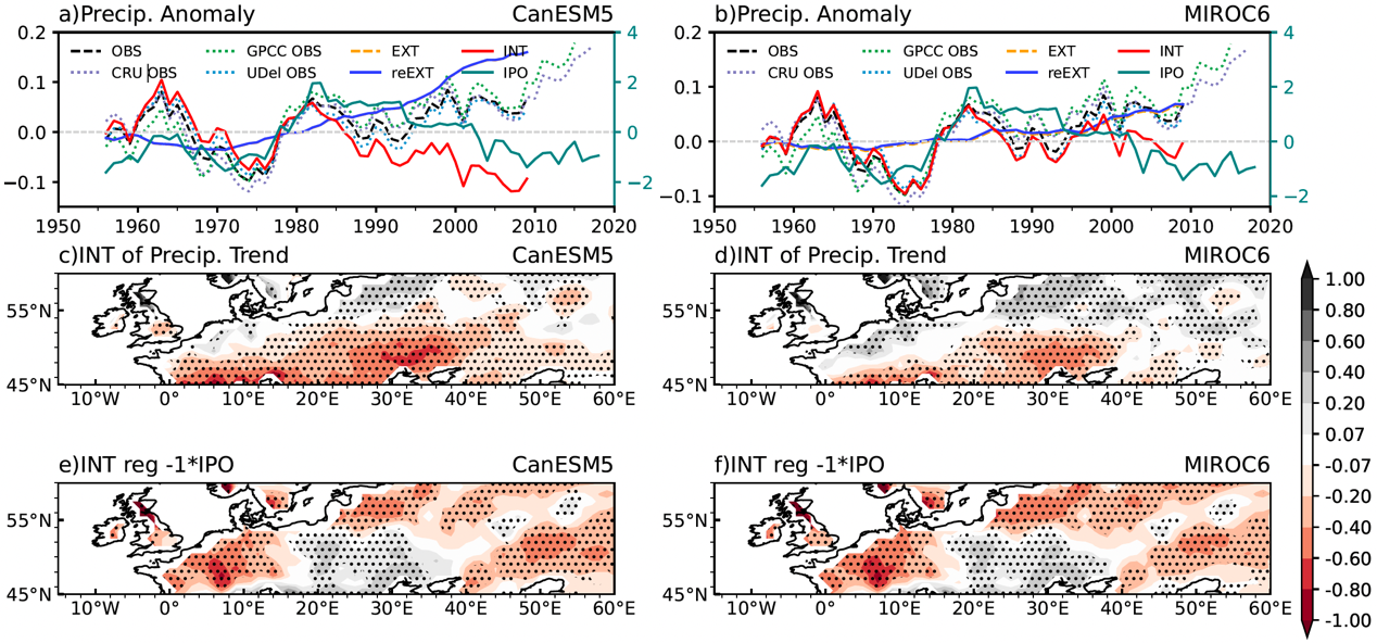 图一 (a–b)北欧冬季降水异常的时间演变(基于多套观测资料),并与太平洋年代际振荡(IPO)指数进行对比。黑色虚线表示观测资料的平均结果。图中区分了外强迫引起的降水变化与气候系统内部自然变率所产生的降水异常。(c–d)去除外强迫影响后,由气候系统内部自然变率主导的北欧冬季降水长期变化趋势。(e–f)北欧冬季降水的内部变化与太平洋年代际振荡(IPO)之间的统计关系。点状区域表示回归关系在90%置信水平上显著。