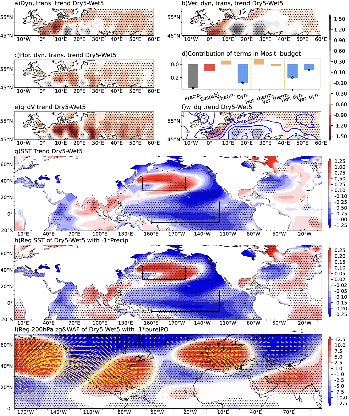 图二 (a–c)在SSP5–8.5情景下(2015–2050年),CanESM5大集合中最干与最湿的5个集合成员之间的水汽输送差异,包括(a)总的动力水汽输送,以及其(b)垂直分量和(c)水平分量。(d)水汽收支各分量对北欧冬季降水差异的贡献。黄色虚线将结果划分为三个部分,星号标出对降水变化贡献最大的关键过程。(e–f)与(a)类似,但分别展示由水平风异常和垂直运动异常主导的水汽输送差异。(f)中蓝色等值线表示整层平均的垂直速度变化。(g)最干与最湿集合成员之间的海表温度(SST)变化趋势差异。(h)SST差异与北欧冬季降水年代际变化之间的统计关系。(i)去除ENSO影响后,北欧冬季降水的年代际变化与200 hPa位势高度之间的关系及对应的波活动通量。图中点状区域表示差异或统计关系在90%置信水平上显著。