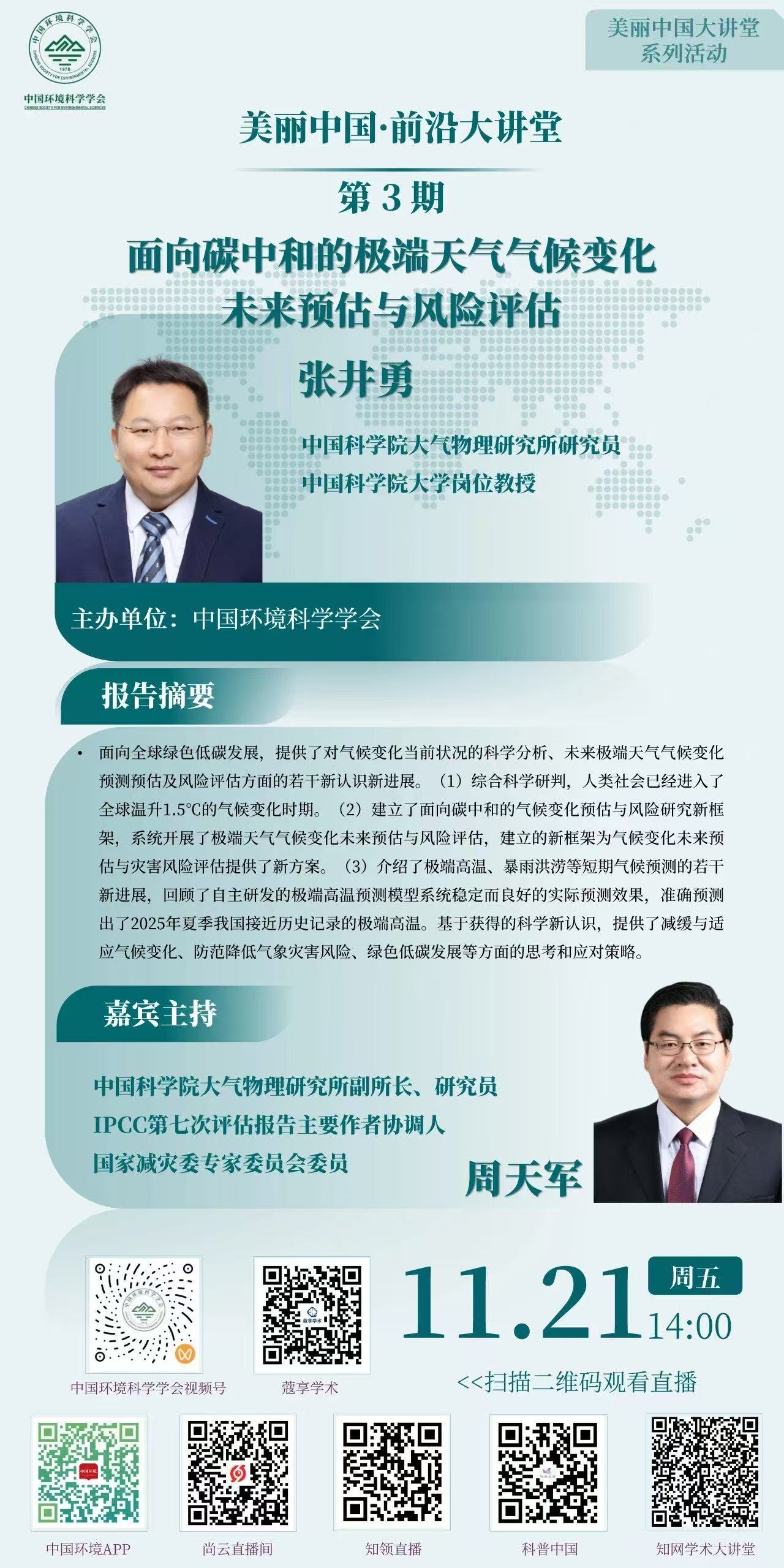【11.21直播预告】美丽中国前沿大讲堂第三期——面向碳中和的极端天气气候变化未来预估与风险评估